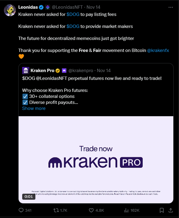 On November 16, Kraken made a pivotal announcement: $DOG Runes futures are now live on their platform. This marks a significant milestone for the token, as it brings: