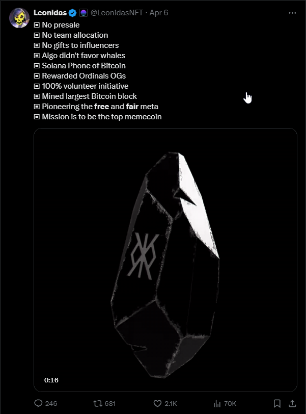 $DOG Runes, also known as DOG•GO•TO•THE•MOON, is a BRC-20 token launched on the Bitcoin blockchain as part of the Runestone Ordinals project. Introduced in April 2024, it was airdropped absolutely free to holders of the Runestone Ordinals by LeonidasNFT, making it the most widely held Runes token at that time. Leonidas launched $DOG with a ‘fair and free’ mentality, not rewarding whales, KOLS or paid shills. With a total supply of 99.98 billion tokens, $DOG Runes has become a symbol of the Bitcoin meme coin movement. The project taps into Bitcoin’s security and network effects while embracing the community-driven culture of meme coins.