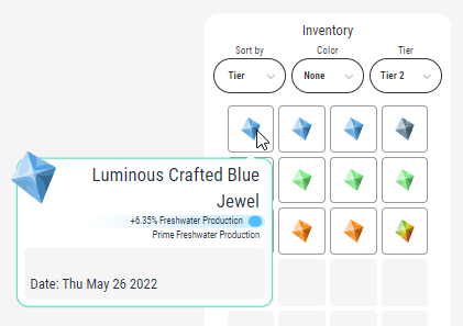 Tier 2 Prime Jewels are crafted from Tier 1 Jewels, and provide a higher % boost of the underlying resource, if any, when slotted into a property. For example, if you upgrade your Tier 2 Jewel with shards to a Luminous Blue, you obtain a higher percentage (ie. 6.35%) boost for freshwater when slotting a blue prime jewel onto a property. Two Tier 2 (“T2”) jewels can be further combined to create additional types of  hybrid jewels, as shown in the table below.