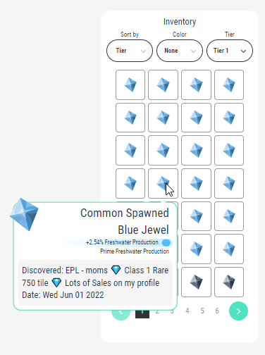 Tier 1 Jewels are basic and provide a simple % boost of the underlying resource, if any, when slotted into a property. For example, 2.54% boost for freshwater when slotting a blue jewel onto a property. There are 8 basic jewel colors with a corresponding resource: