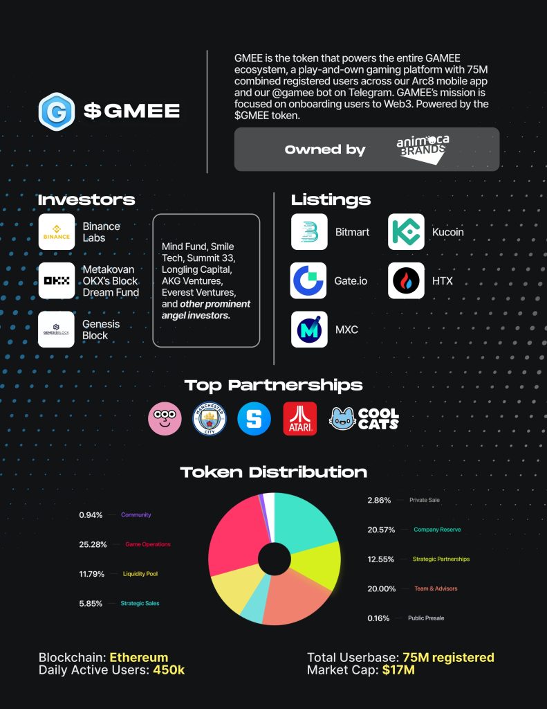.The GMEE token is used across other Apps and DApps owned by its parent company Animoca Brands.